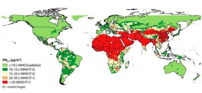 Trong biểu đồ, chúng ta có thể thấy rằng gần 2/3 thế giới, chủ yếu là Châu Á, Trung Đông và Châu Phi đang phải hứng chịu nạn ô nhiễm khủng khiếp với chỉ số hạt bụi PM2.5 cao trên mức 35 µg/m2 khí.