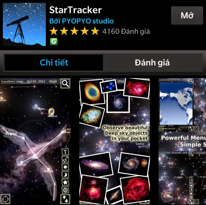 Bạn có sở thích thiên văn? Bạn muốn ngắm và tìm hiểu thông tin về các chòm sao trên bầu trời đêm? Bạn đã đọc qua bộ truyện Áo giáp vàng - Saint Seiya? StarTracker sẽ giúp bạn thỏa mãn niềm đam mê đó.Ứng dụng này có tốc độ, phản ứng nhanh và chính xác về các chòm sao trên bầu trời. Chỉ cần giữ và chọn điểm cần xem các ngôi sao, chòm sao và các hành tinh trên bầu trời, nó sẽ giúp bạn kiếm thông tin về các chòm sao đó theo thời gian thực.StarTracker tận dụng đầy đủ các tính năng có sẵn của BB10 như con quay hồi chuyển, la bàn số và gia tốc kế, cho phép bạn quan sát như thật. Các tính năng của ứng dụng: ★ Augmented RealityStar Gazing with gyroscope! Just hold up the device. ★ Sun, Moon, planets and 8000+ stars visible to the naked eyes. ★ 88 Constellations & 100+ deep sky objects with magnificent graphics. ★ All data is offline! ★ Search and Lock the objects in Solar system, 12 Zodiac Constellations, 88 Constellations, Deep Sky Objects and Famous Stars. ★ 3D compass in AR mode, indicate position of objects your searched. ★ Location auto set by GPS, or set manually. ★ Time Machine. Time and date can be adjusted smoothly. ★ Smooth motion flow and quick response which is realized by cutting edge signal processing technique. ★ Superb high quality graphics with full screen anti-aliasing. Vài hình ảnh của ứng dụng: Video giới thiệu: Ứng dụng hiện đang được bán với giá 2.99$ trên BB World. Và tiếp tục lần này sẽ có redeem cho các bạn. Tuy nhiên, do hàng hiếm nên số lượng không nhiều, nếu ko ăn được redeem cũng đừng buồn nhé . Sẽ cập nhật sớm cho các bạn, theo dõi topic và channel C002B1882 nhé redeem : STARVIETNAM Download:(2.99$)