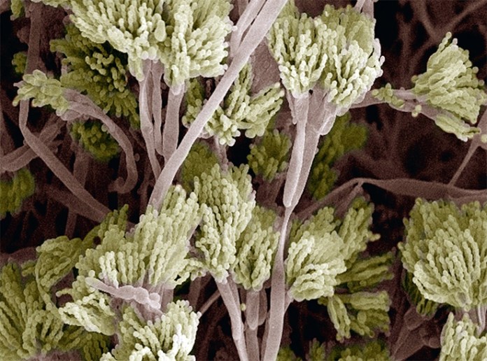 Giống như một bó hoa được bán trong cửa hàng, kính hiển vi điện tử quét màu này hiển thị thân cây nấm Penicillium.