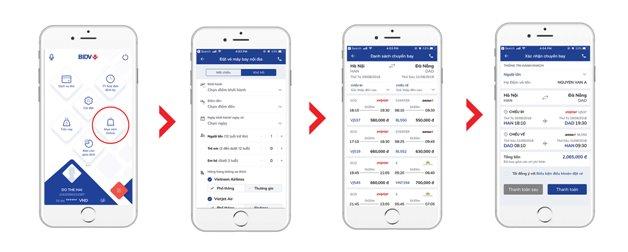Để đặt vé máy bay với Mobile Banking, khách hàng đăng nhập ứng dụng, chọn tính năng Đặt vé máy bay, lựa chọn hành trình bay (điểm đi/đến, thời gian). Ứng dụng sẽ tự động đề xuất các chuyến bay của các hãng, sắp xếp theo mức giá từ thấp đến cao. Khách hàng lựa chọn chuyến bay phù hợp, nhập thông tin hành khách. Xác thực thông tin và thanh toán, màn hình thông báo đặt vé thành công.