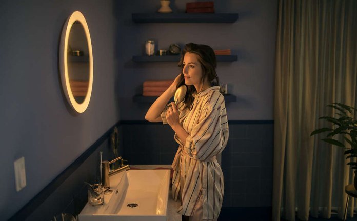 Adore Bathroom. Cũng giống như các đèn khác trong dòng Hue thì Adore Bathroom cũng có thể điều khiển qua smartphone hoặc các dòng loa thông minh. Chiếc đèn kiêm gương này cũng có một điều khiển không dây để chỉnh độ sáng của đèn viền xung quanh.