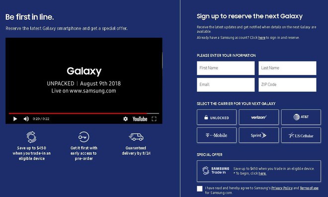 Samsung cũng không nói rằng thiết bị này là Galaxy Note 9, nhưng chúng ta có thể khá chắc chắn khi mô tả đây là một chiếc phablet và có hình ảnh chiếc bút S-Pen mới. Có 6 lựa chọn cho những người đặt trước, bao gồm các nhà mạng Verizon, AT&T, T-Mobile, Sprint, US Cellular và một phiên bản không khóa mạng.Bên cạnh đó, Samsung cũng cho phép khách hàng đổi những chiếc smartphone cũ của mình để lấy Galaxy Note 9. Có khoảng 35 chiếc smartphone thuộc 4 hãng Samsung, Apple, LG và Google nằm trong danh sách này. Với một chiếc Galaxy S9+ hoặc iPhone X cũ, bạn có thể được giảm giá khoảng 450 USD khi mua Note 9 mới.Galaxy Note 9 được trang bị màn hình AMOLED thiết kế Infinity Display, kích thước 6,4 inch. Bên trong được Samsung trang bị chip Snapdragon 845, bộ nhớ RAM 6GB. Galaxy Note 9 sẽ có camera kép ngang ở phía sau và cảm biến vân tay được đặt bên dưới. Chiếc bút S-Pen cũng sẽ được nâng cấp hoàn toàn mới.Tham khảo: gsmarena