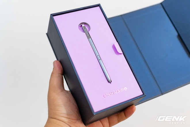 Hai cây bút S-Pen trong hộp của Galaxy Note9 Special Edition. Trong đó, cây bút màu xám được gắn mặc định vào máy. Bút màu tím được đi kèm bên trong hộp.
