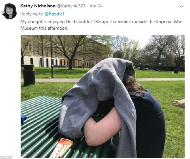 “Đây là cách con gái tôi thưởng ngoạn một buổi chiều nắng đẹp rực rỡ 18 độ C bên ngoài bảng tàng chiến tranh”.