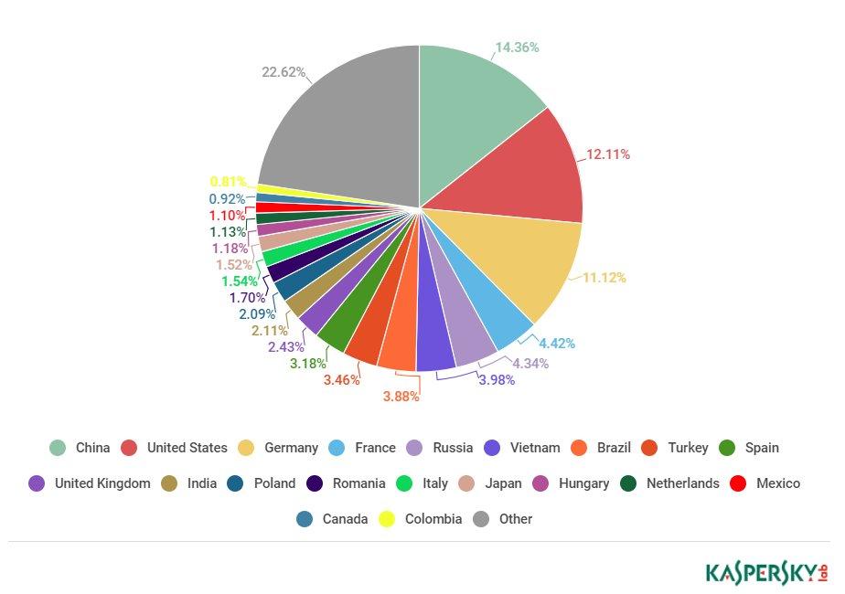 Các quốc gia nhận nhiều thư rác trong quý 2/2018 – Nguồn: Kaspersky |